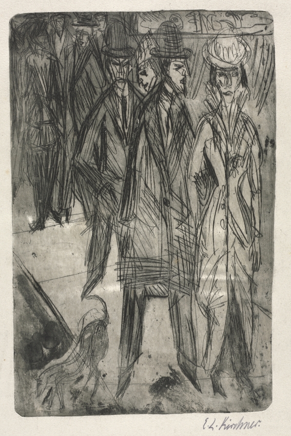Combining etching and aquatint techniques, Kirchner portrays urban alienation through sharp angles and distorted figures, reflecting the anxiety of pre-war Berlin.
