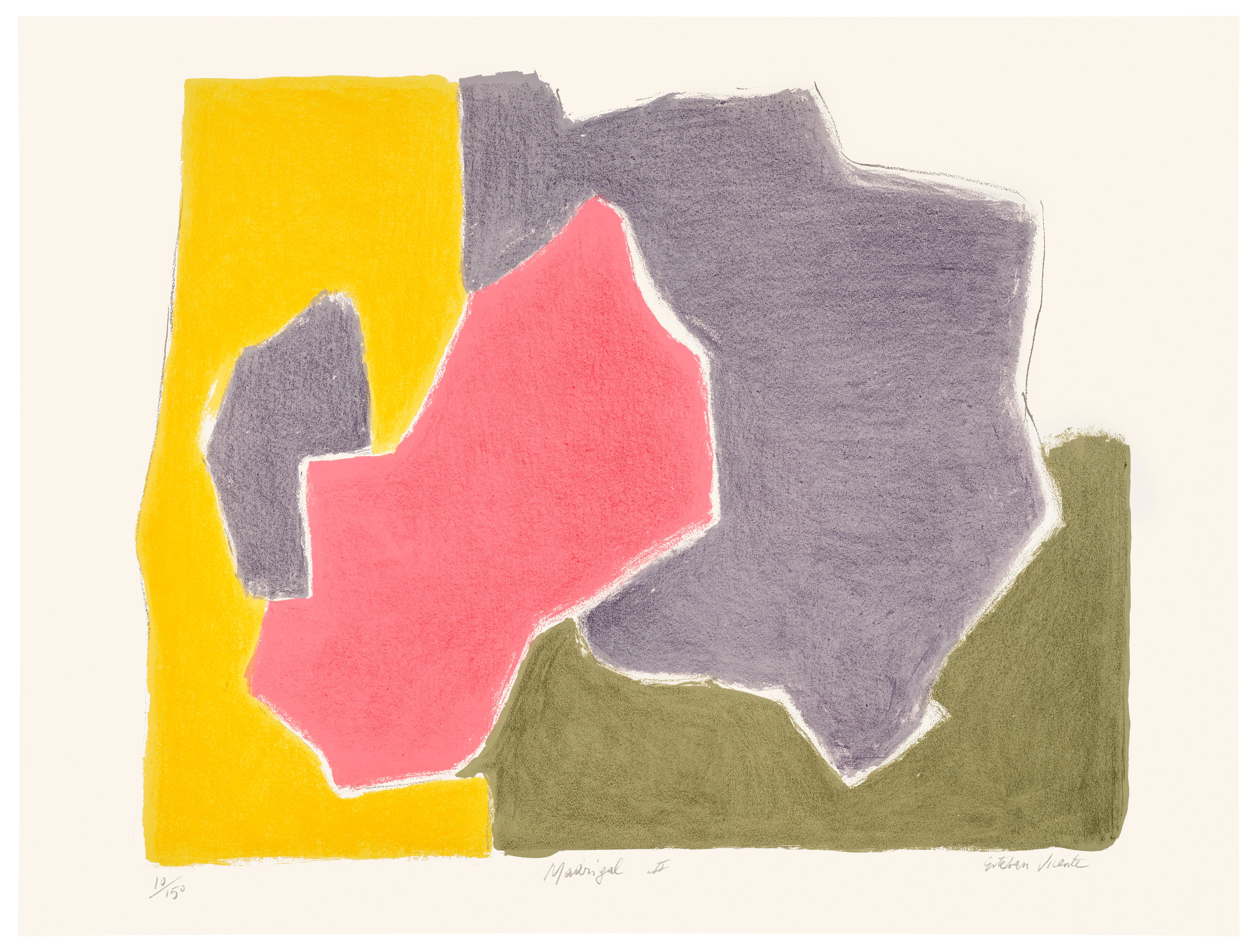 Esteban Vicente's 'Madrigal II' is a color lithograph on wove paper with full margins, showcasing the artist's abstract sensibility. The work combines lyrical composition with the medium's technical possibilities. Vicente's approach balances color relationships with gestural mark-making.