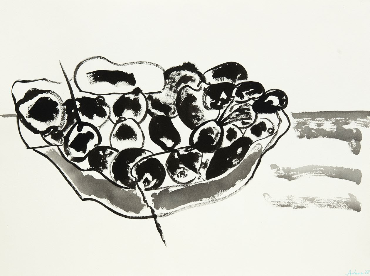 Fruits is a striking work rendered entirely in India ink on paper, showcasing Adnan's ability to create bold visual impact through the expressive potential of a single medium. The work demonstrates her interest in subject matter drawn from daily life and nature, transformed through gestural abstraction and minimalist sensibility into something both intimate and monumental. The precision and spontaneity of ink work allow Adnan to explore the boundary between drawing and painting, between figuration and abstraction. This small format work exemplifies the artist's prolific practice across multiple mediums and her gift for distilling complex visual ideas into essential forms.