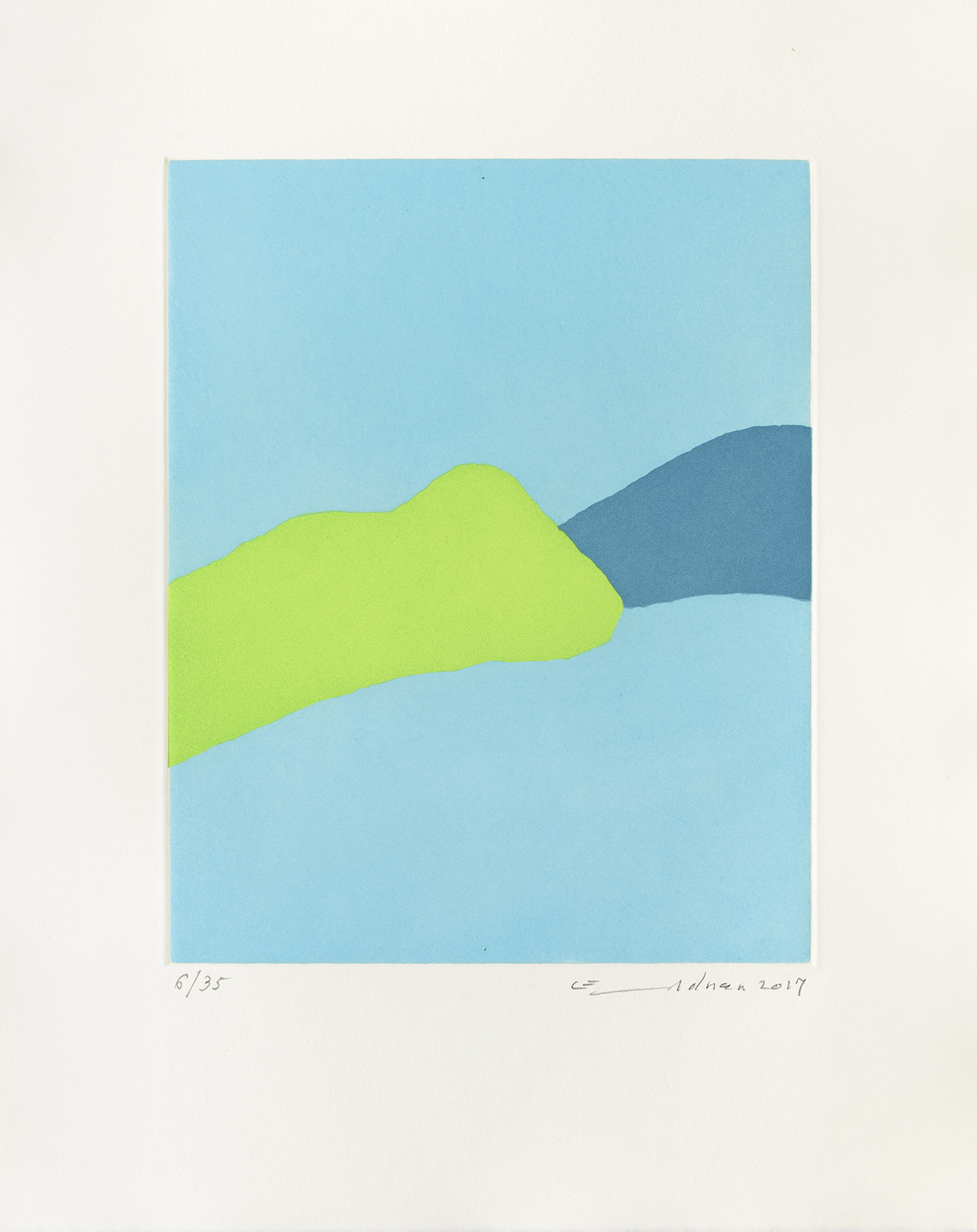 Frankenthaler's color etchings and prints share Adnan's use of sweeping organic forms in luminous, saturated hues against open grounds, with both artists reducing landscape and light to essential flowing shapes and pure color relationships.
