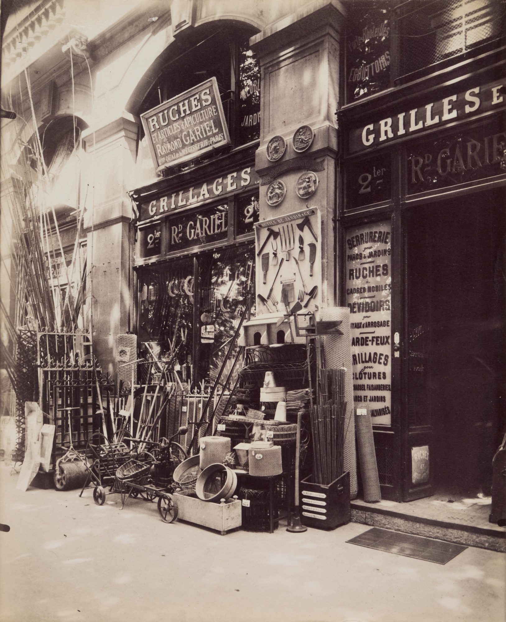 This albumen print by Eugène Atget documents a beekeeping supply shop on the Quai de la Mégisserie in Paris, capturing the storefront with characteristic documentary precision typical of the photographer's extensive survey of Parisian commerce and street life in the early twentieth century. Atget's meticulous approach to urban photography transformed ordinary commercial scenes into significant historical records, preserving details of Parisian material culture before modernization. The work exemplifies Atget's methodology of systematically cataloging Parisian subjects, as evidenced by the pencil notation of its inventory number on the reverse, reflecting his archival approach to photography.