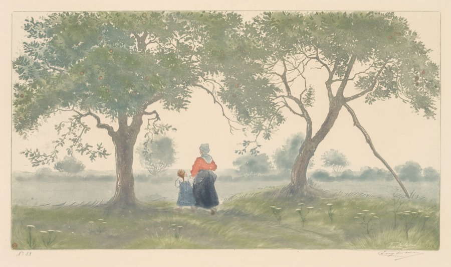 "Les Pommiers" (The Apple Trees) by Eugène Delâtre is a color aquatint that exemplifies the artist's mastery of this delicate printmaking technique, which allows for subtle gradations of tone and nuanced color effects. The work captures a serene landscape or garden scene focused on apple trees, rendered with the soft, luminous quality characteristic of aquatint printing. Delâtre's technical skill in layering transparent color plates demonstrates why he was renowned as both a painter and one of the most accomplished aquatintists of his era.