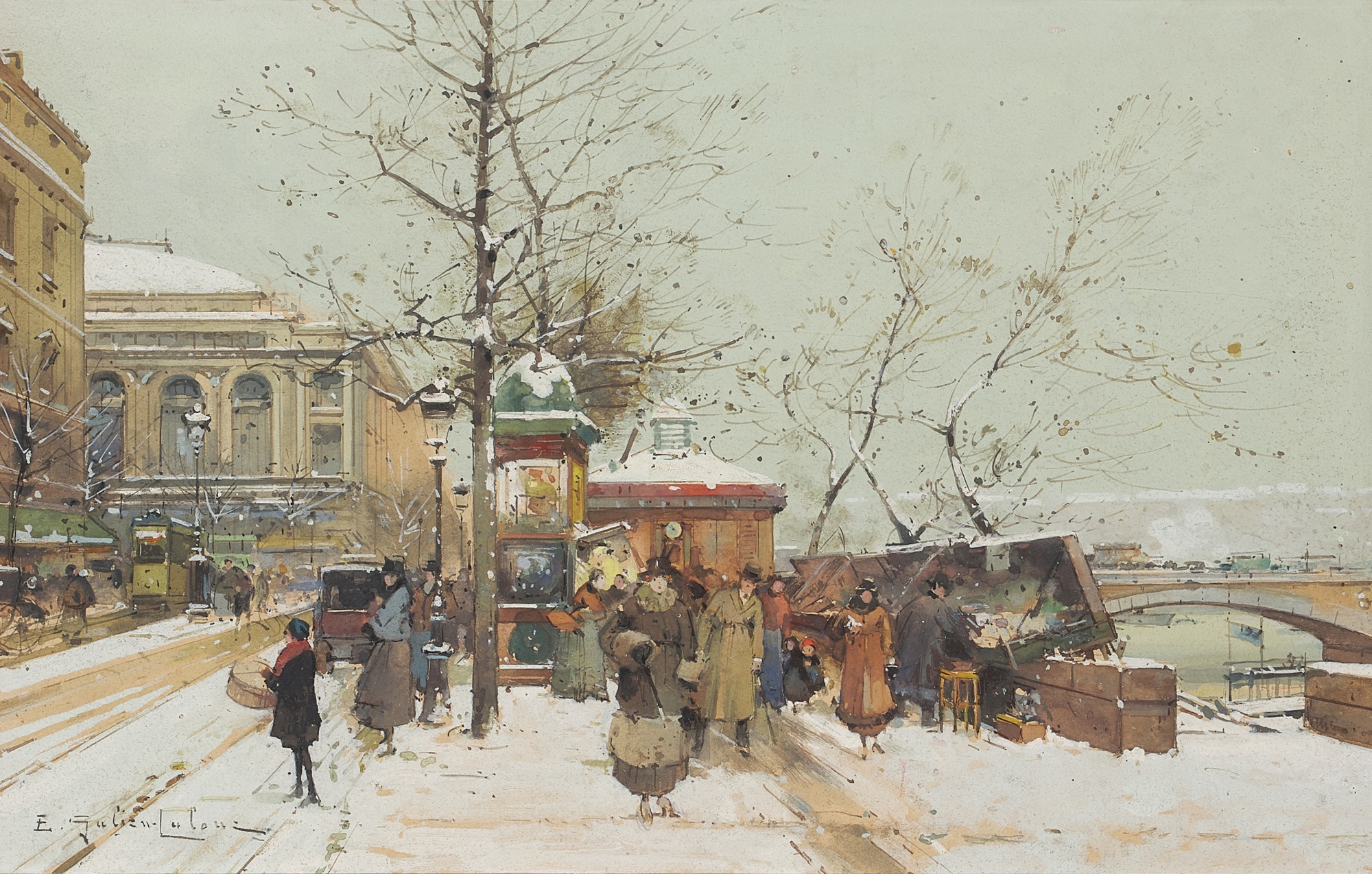 Eugène Galien-Laloue's 'Le Théâtre du Châtelet et le Pont au Change' captures a Parisian landmark and bridge scene, characteristic of the artist's romanticized urban landscapes. The work showcases Galien-Laloue's ability to render bustling Parisian street life with charm and detail.