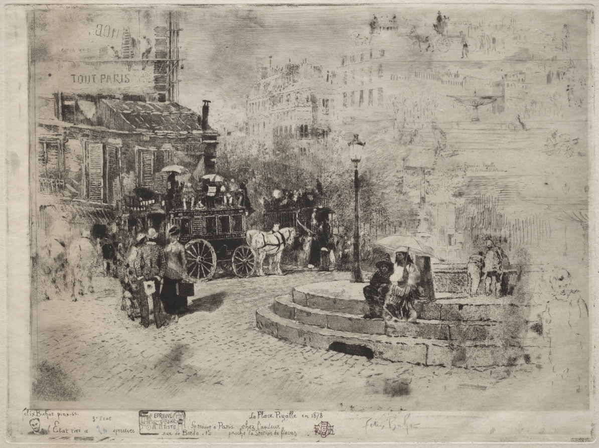 Bustling Montmartre nightlife comes alive in a complex composition that showcases Buhot's innovative use of multiple etching techniques to create atmospheric depth.