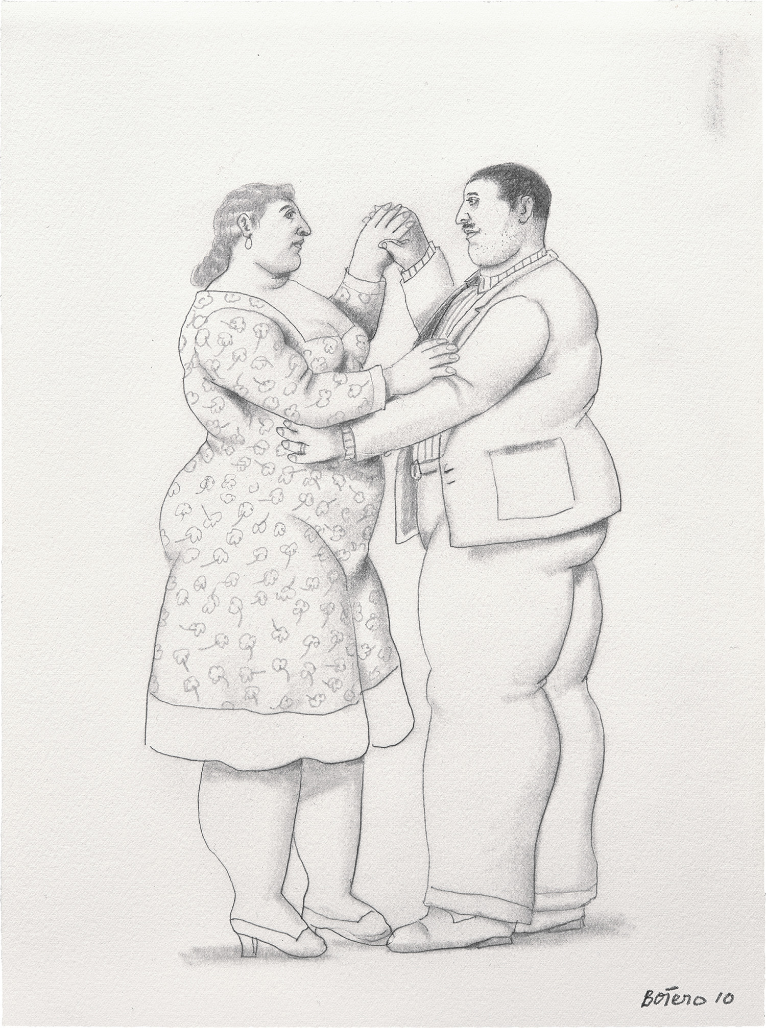 Fernando Botero's 'Dancers' is a pencil drawing on paper created in 2010. The work showcases the artist's characteristic style of portraying figures with exaggerated, voluminous forms in a graceful composition.