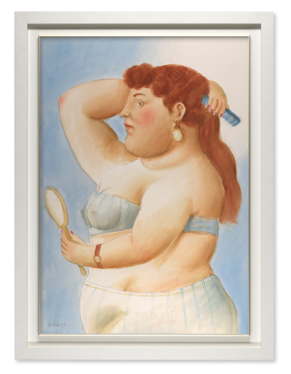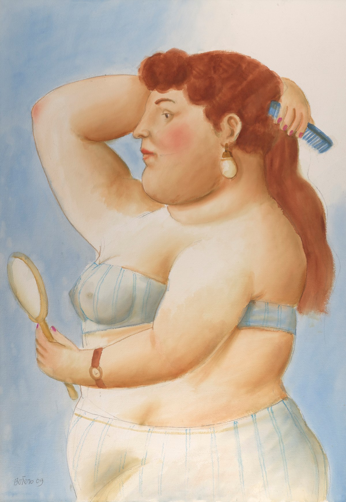 A voluptuous reclining figure rendered in Botero's signature style dominates the composition, her exaggerated, rounded forms conveying a sense of monumental sensuality and repose. The delicate interplay of watercolor washes, pastel, and graphite on thick paper creates a rich layering of texture and tone, blending soft, luminous color with precise draftsmanship. Botero's masterful command of the figure is evident in the harmonious balance between the sketch-like graphite underdrawing and the warm, flesh-toned pigments that bring the subject to life.