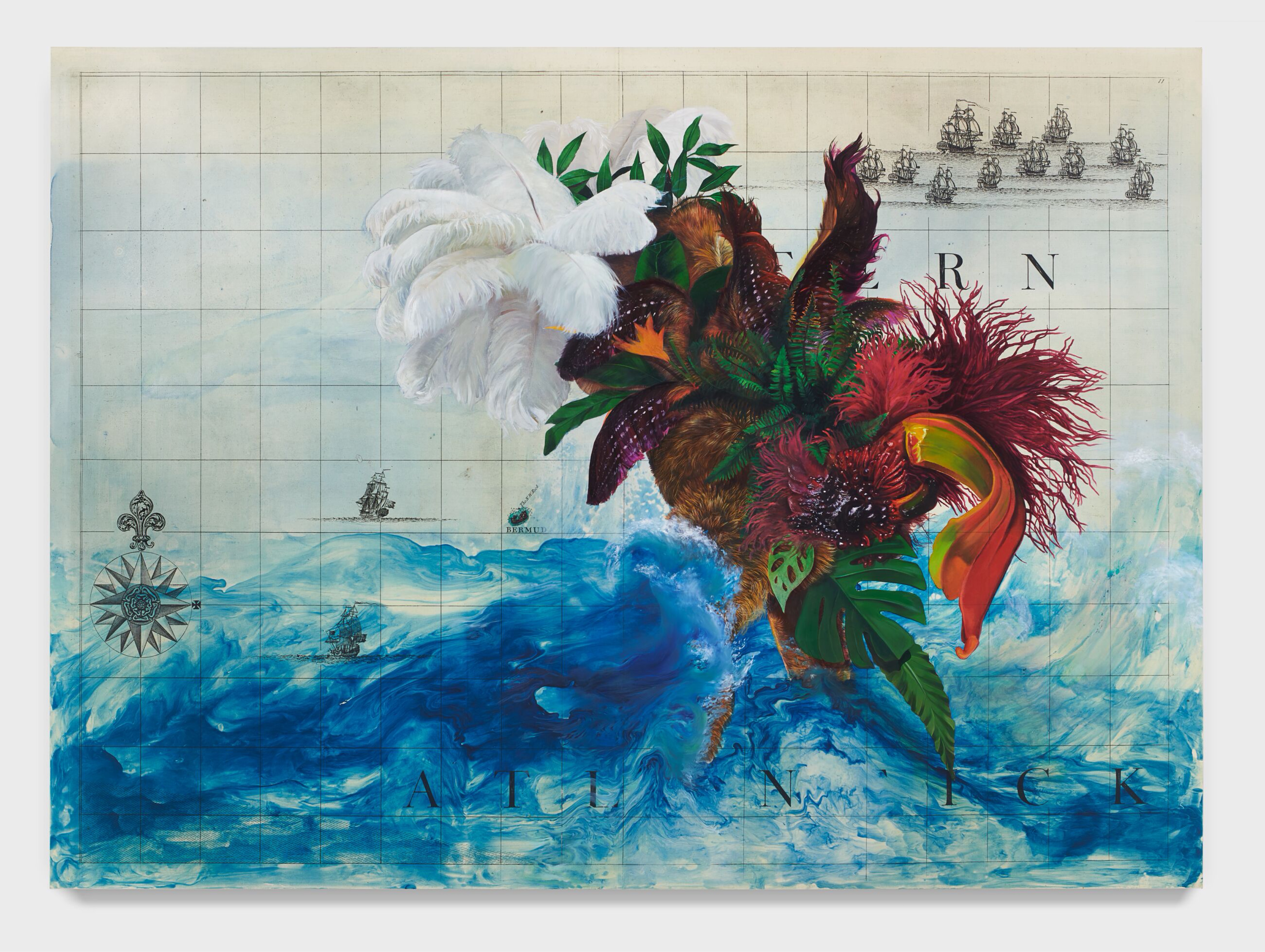 A monumental large-format painting by Firelei Báez layering acrylic and oil paint over an archival printed canvas bearing a historical map of the Atlantic Ocean, with partial text reading 'ATLANTIC' and 'ERN' visible beneath dramatic ocean waves rendered in vivid cobalt blue. A spectacular central motif of tropical foliage, feathers in white, crimson, and deep brown, and lush greenery erupts from the churning sea, partially obscuring cartographic details including sailing ships, a compass rose, and the word 'Bermuda.' The work engages critically with colonial history, mapping, and Caribbean identity, hallmarks of Báez's celebrated practice. Offered through Hauser & Wirth, this significant unique painting measures nearly 2.5 by 3.4 meters.