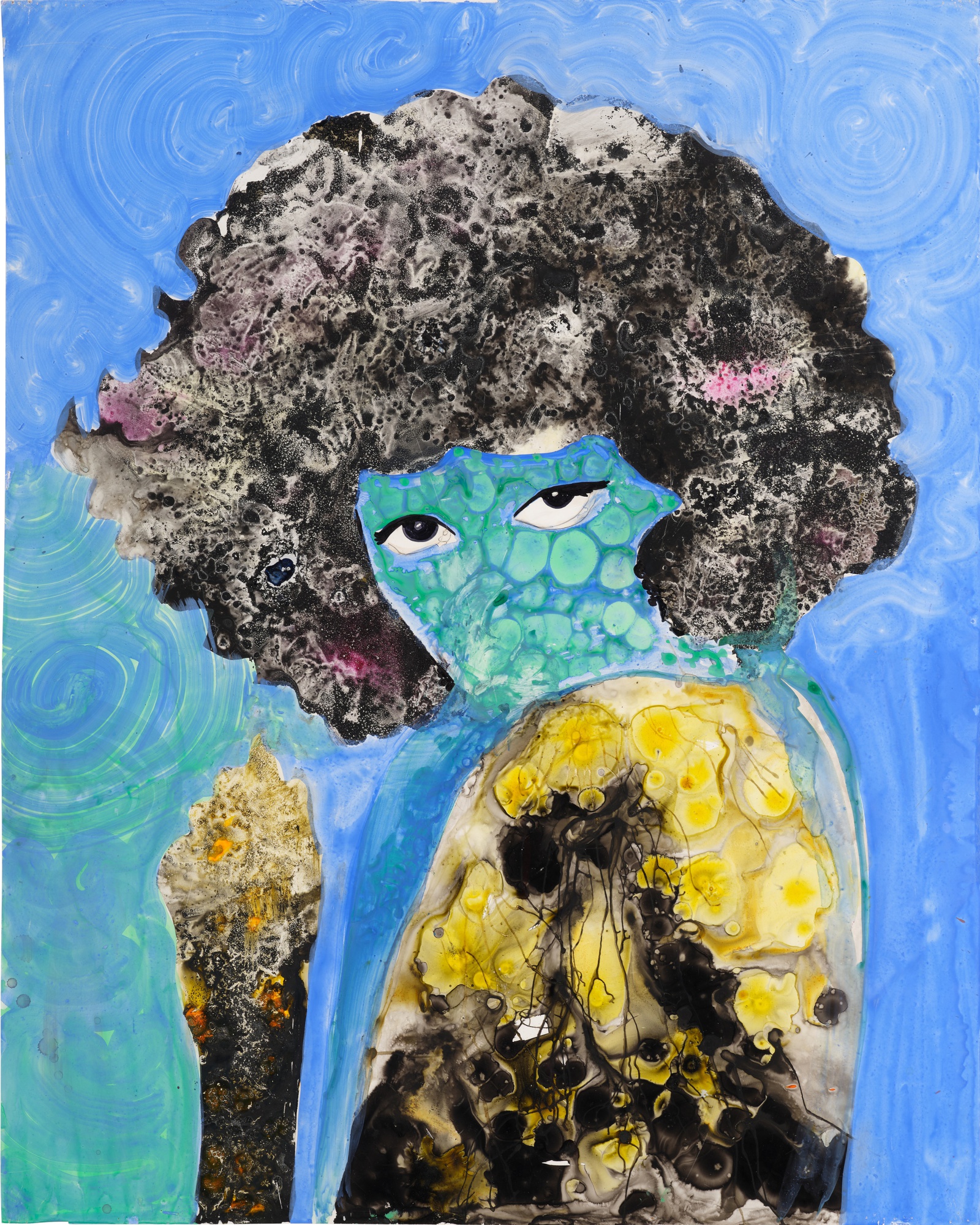 "Patterns of Resistance" by Firelei Báez combines acrylic and Sennelier ink on Yupo paper to create a visually striking composition that reflects the artist's characteristic exploration of Caribbean history, identity, and resistance. Báez's layering of these media produces rich color interactions and textural complexity, with the non absorbent Yupo paper allowing for distinctive paint effects and fluid ink applications. The work exemplifies her practice of interweaving decorative patterning with figural imagery to address themes of cultural resilience and historical memory.