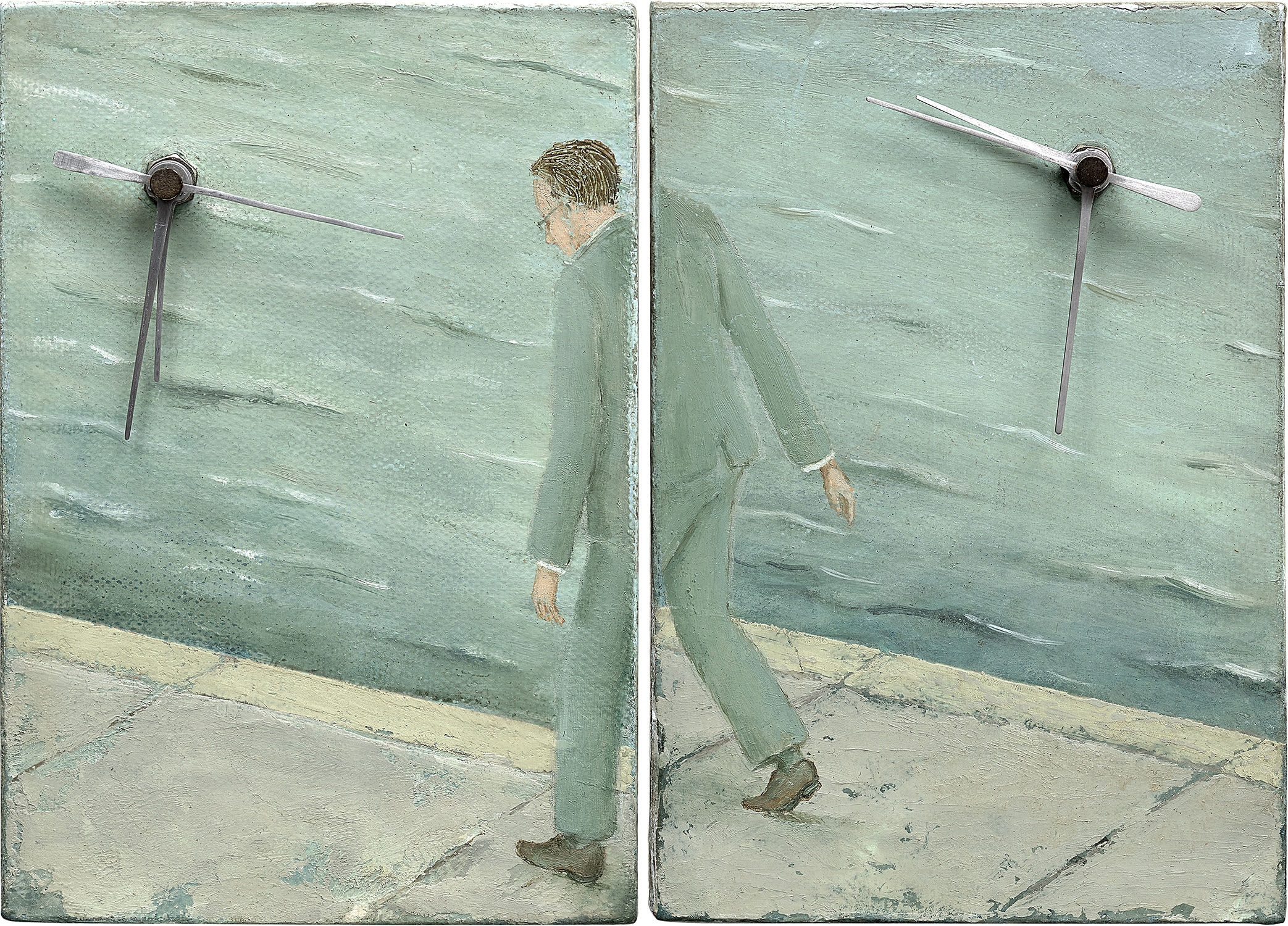 Two nearly identical painted panels depict a solitary figure traversing a vast, hazy landscape, their repeated presence evoking a sense of temporal looping and uncanny familiarity. Embedded within the canvas, a functioning clock disrupts the stillness of the painted surface, merging the passage of real time with the cyclical nature of memory and perception. Through the tension between oil and encaustic's layered, dreamlike surfaces and the mechanical tick of the clock, Alÿs meditates on the disorienting experience of reliving a moment that may never have occurred.