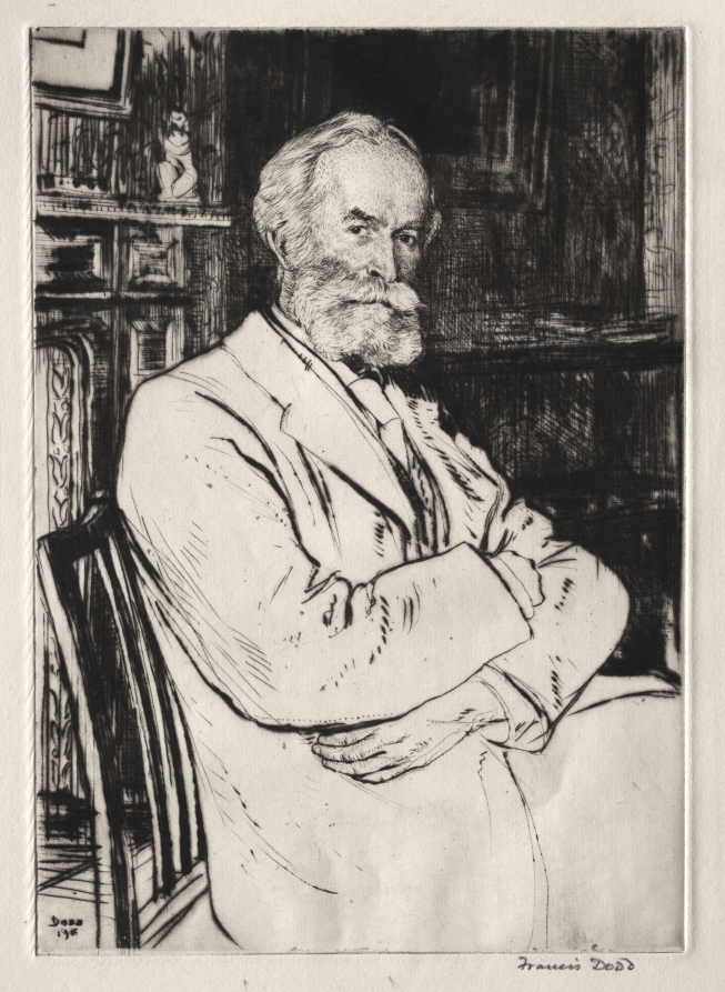 Rendered with the precise cross-hatched lines characteristic of drypoint technique, this portrait captures the distinguished bearing of a prominent Edwardian gentleman with remarkable psychological depth.