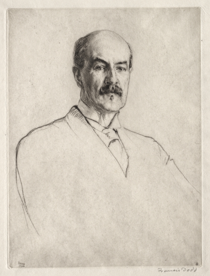 Francis Dodd's drypoint portrait of Professor Oliver Elton exemplifies the artist's mastery of the medium through its precise linear technique and sensitive characterization. The work captures Elton's intellectual bearing with economical but expressive line work characteristic of Dodd's printmaking practice. As a drypoint, the print showcases the medium's capacity for tonal variation and delicate detail through the burr created by the needle on the copper plate.