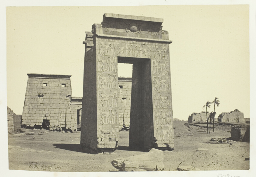 Frith's meticulous documentation of Karnak's monumental gateway demonstrates the albumen process's ability to render intricate hieroglyphic carvings with unprecedented clarity for 19th-century viewers.
