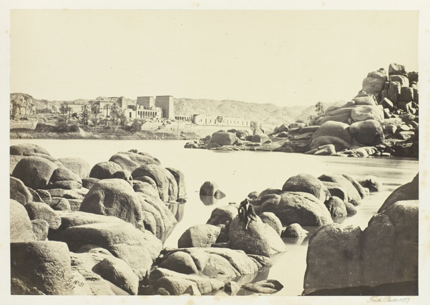 Framed by the photographer's careful composition, the sacred island emerges from the Nile like a jewel of ancient architecture. Frith's albumen print captures the temple complex's dramatic setting at the river's first cataract.