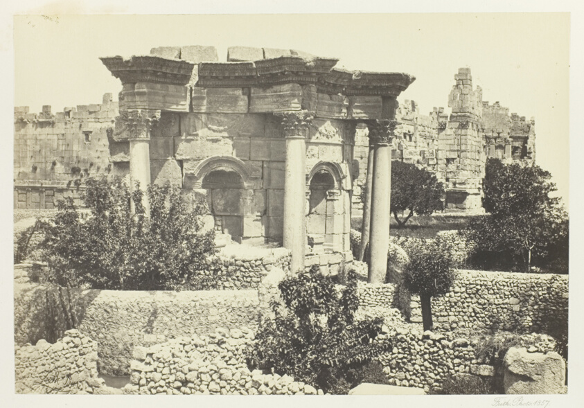 Documenting the Roman ruins of Baalbek in Lebanon, the photograph exemplifies Frith's role as a visual archaeologist during the golden age of Middle Eastern exploration. His precise albumen technique captures the massive scale and intricate stonework of one of antiquity's most impressive temple complexes.