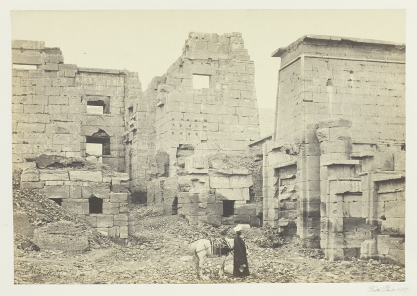 The mortuary temple of Ramesses III appears in Frith's lens as a testament to pharaonic power and architectural ambition. The photograph preserves details of the complex's unique palace-temple design before modern restoration efforts altered its appearance.