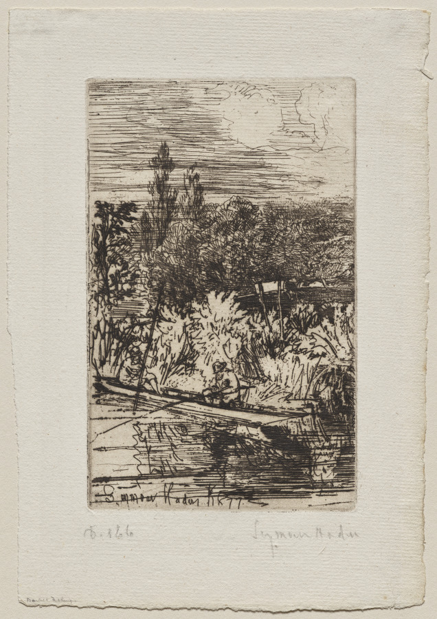 "Barbel Fishing" is an etching by Francis Seymour Haden that depicts a leisurely scene of anglers by a riverbank, showcasing the artist's skill in rendering natural landscapes and atmospheric effects. Haden, a renowned 19th century printmaker and landscape artist, employs delicate lines and careful tonal gradations characteristic of fine etching technique to capture both the tranquility of the fishing subject and the specificity of the English countryside. The work exemplifies Haden's ability to infuse genre scenes with a sense of poetic realism and refined observation of light and water.