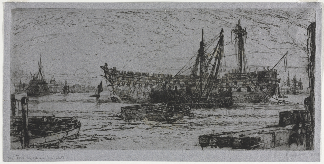Commemorating the demolition of Nelson's flagship, the etching transforms an act of maritime destruction into a poignant meditation on Britain's naval heritage and the passage of time.