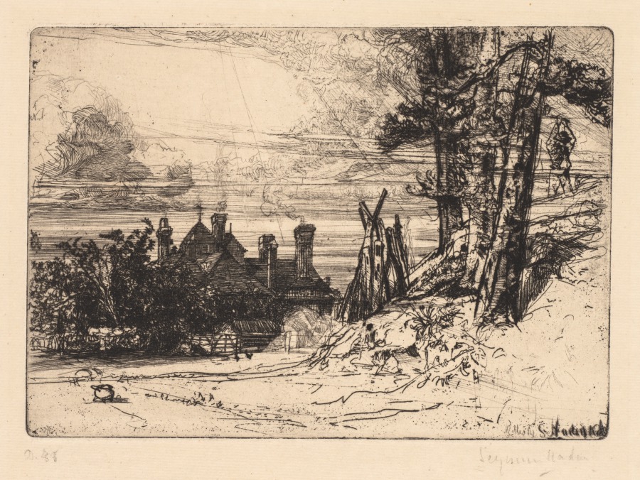 Country house portrait combines architectural documentation with landscape elements, typical of Haden's Victorian gentleman-artist perspective.