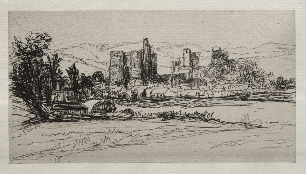 Welsh medieval fortification becomes the subject of atmospheric interpretation, where Haden's etching transforms ancient military architecture into romantic landscape poetry.