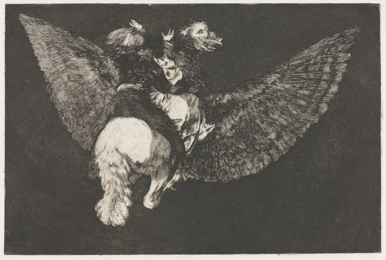 Surreal composition featuring airborne figures showcases Goya's ability to blend fantasy with social critique in his mature printmaking style.