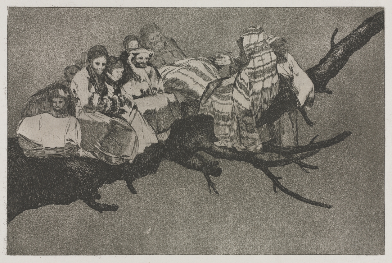 Belonging to Goya's mysterious final print series, the work employs dramatic contrasts of light and shadow to expose the absurdity of human behavior.