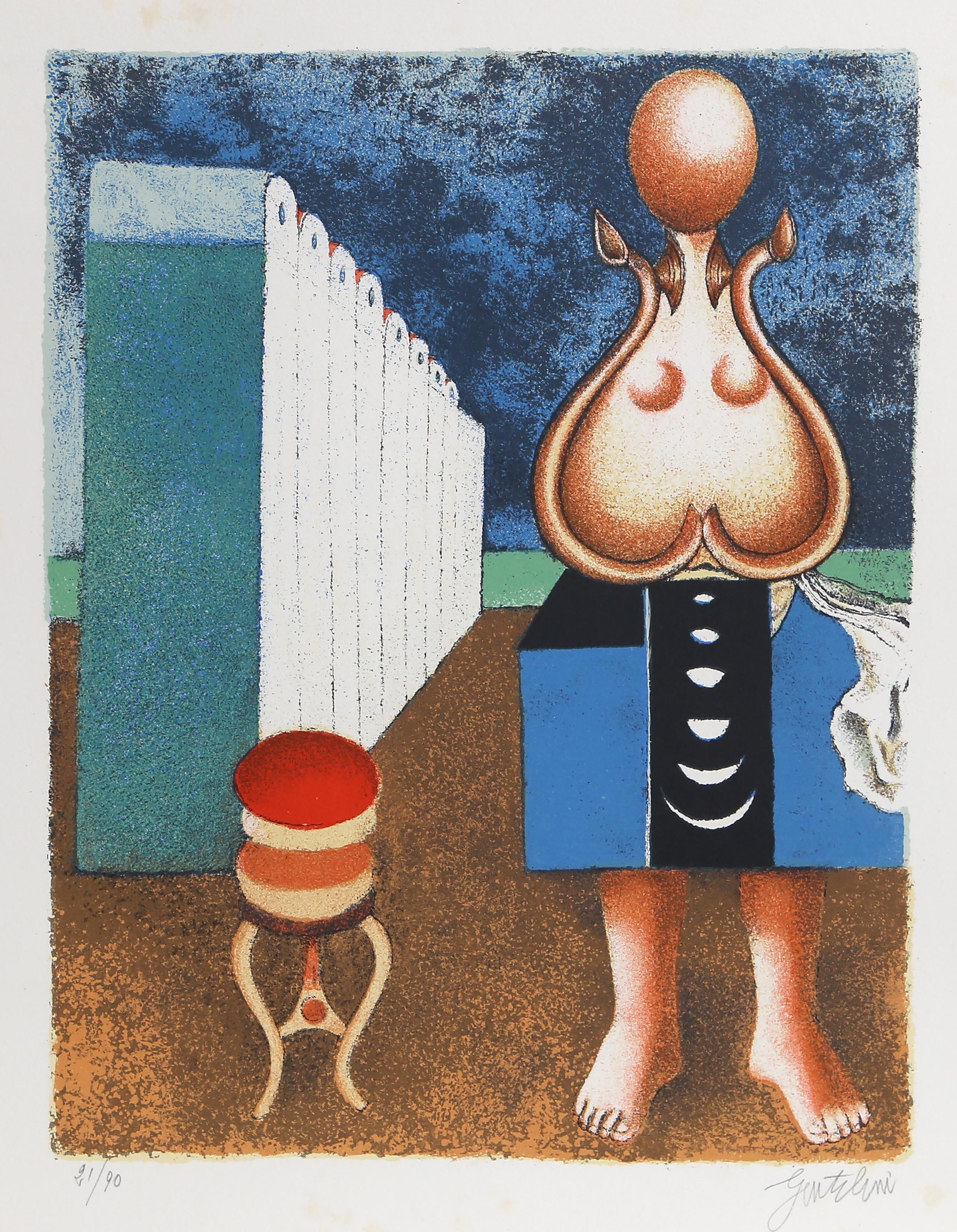 "La Grande Bagnante" is a lithograph by Franco Gentilini, the Italian artist known for his figurative works that often depicted classical themes with a modern sensibility. The print showcases Gentilini's skillful handling of the lithographic medium to render the female bather, a subject drawn from art historical tradition yet treated with his characteristic blend of realism and simplified forms. The work reflects Gentilini's interest in the human figure and his ability to convey both monumentality and intimacy within the intimate scale of the print medium.