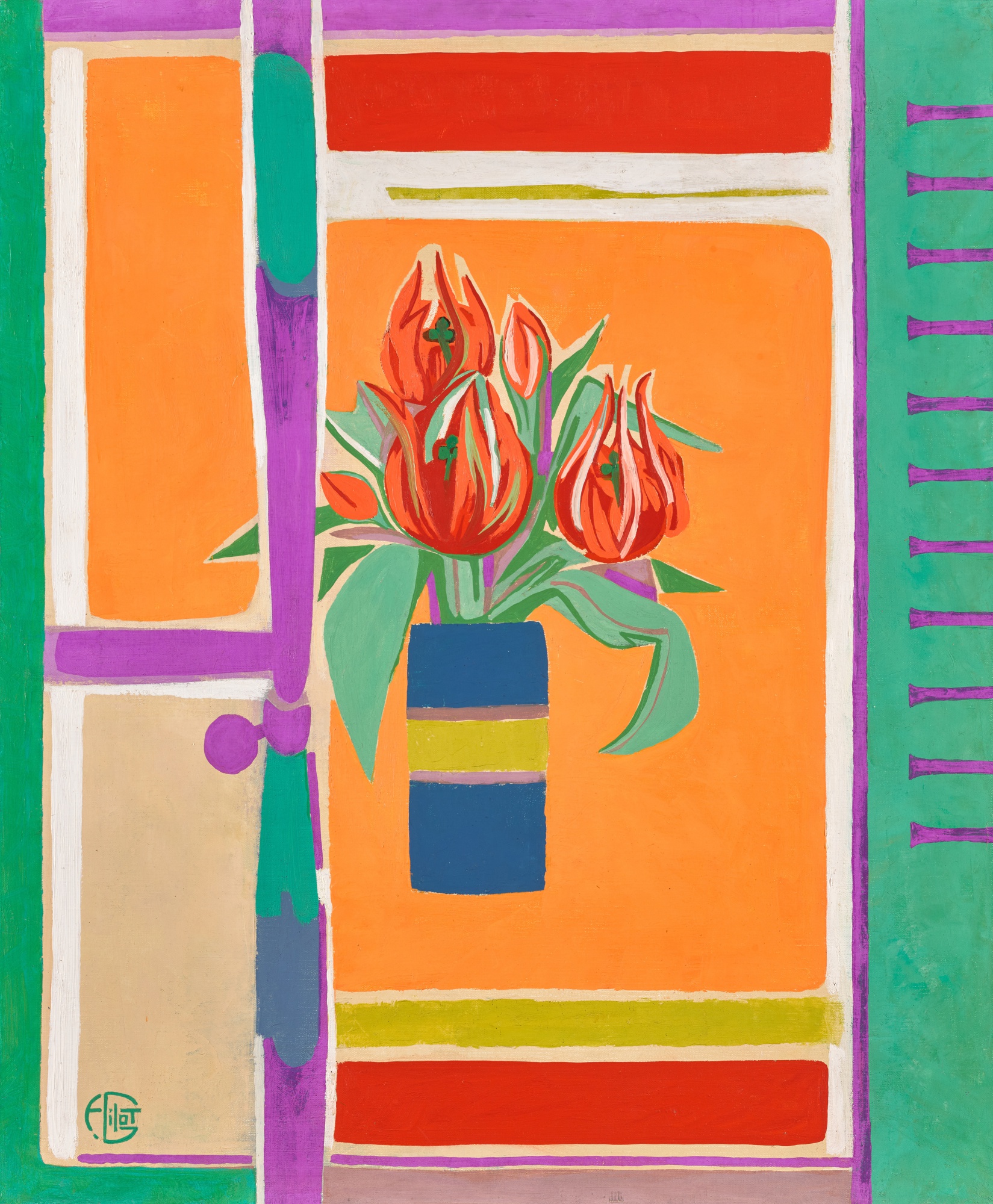 Françoise Gilot's Tulipes Perroquet is an oil on canvas painting from 1979. The work features the artist's characteristic vibrant approach to floral subjects.