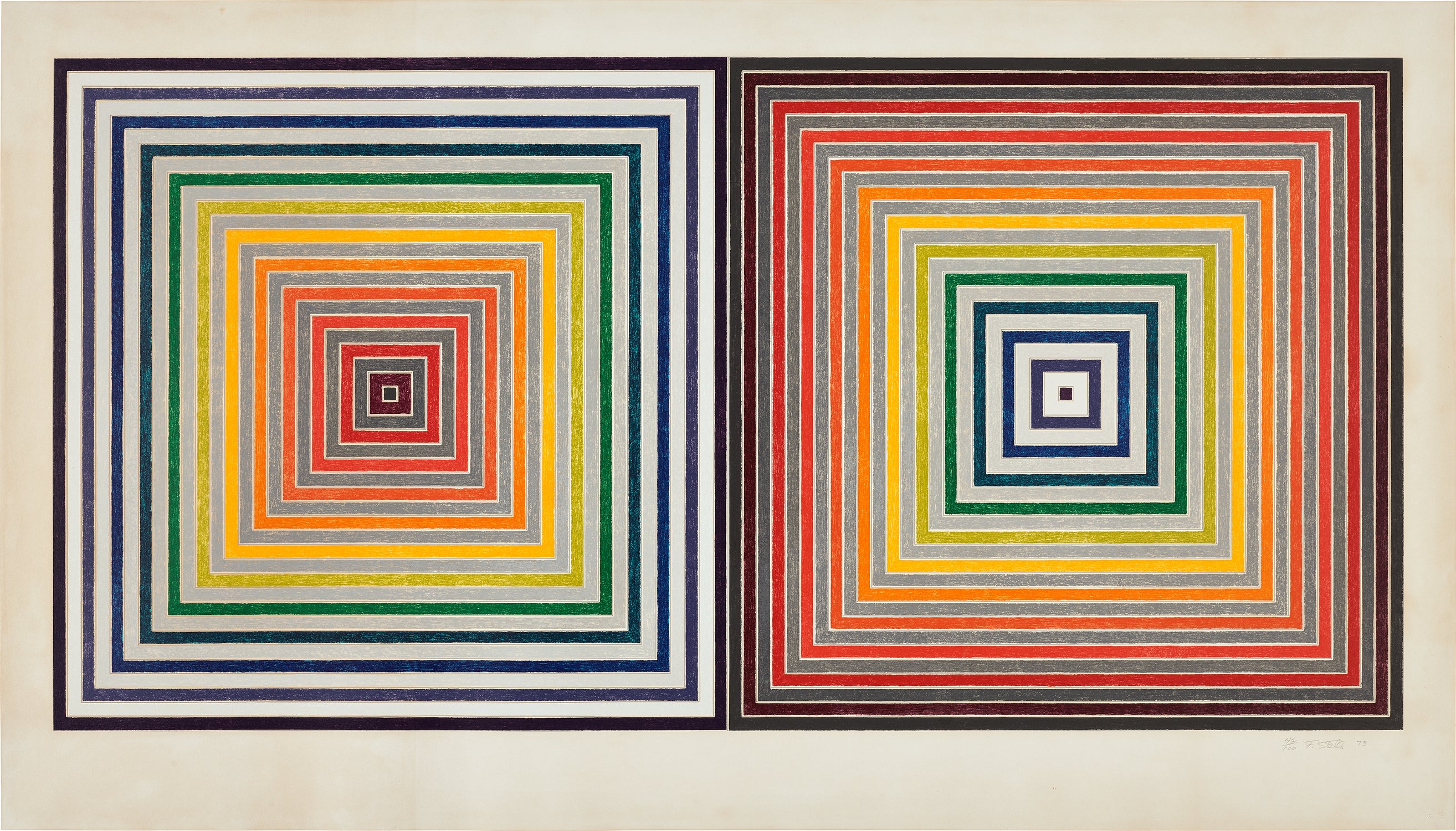 A screenprint by Frank Stella featuring geometric abstraction with gray tones on Arches 88 paper. The work demonstrates Stella's characteristic use of bold compositional elements and vibrant color interactions.