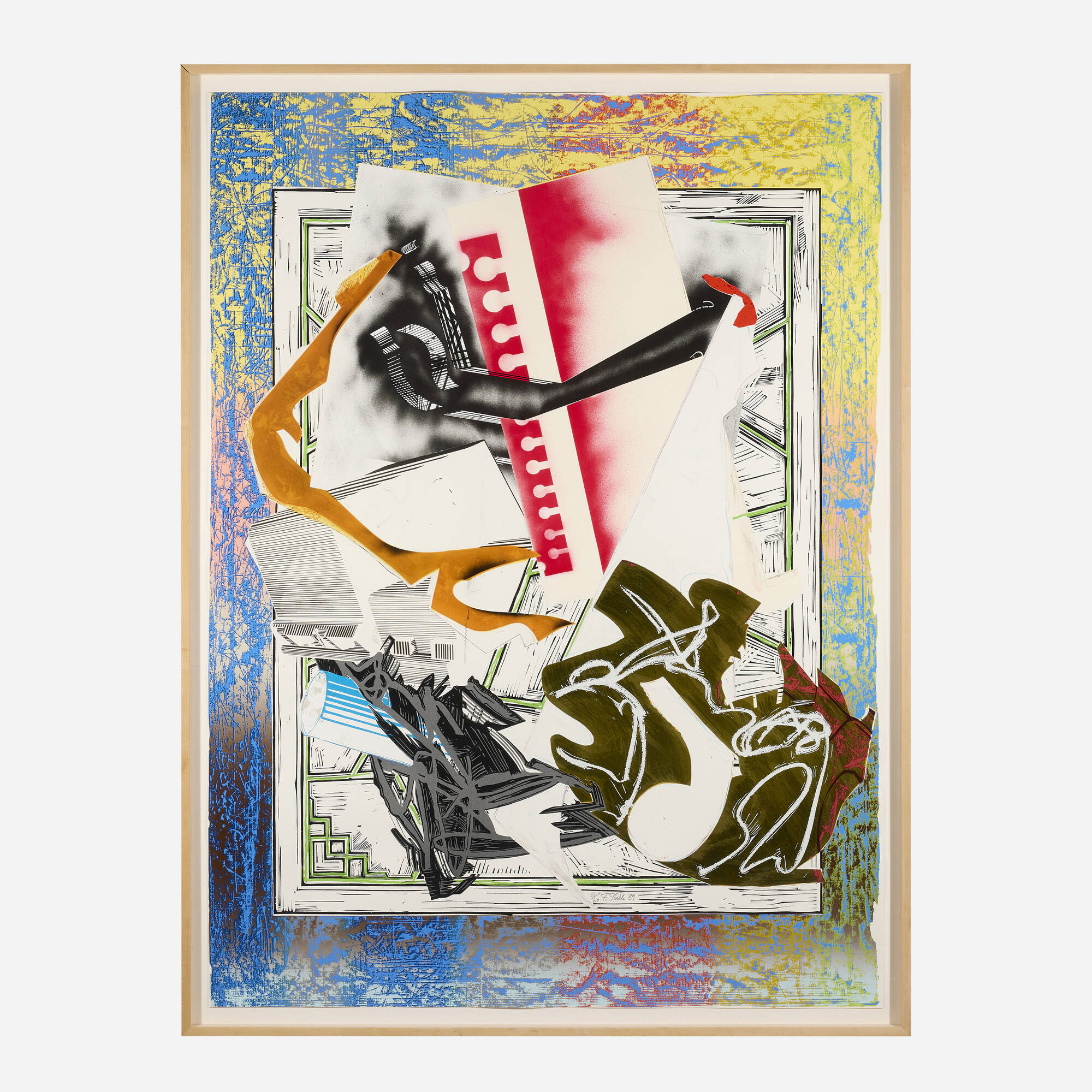 Going Abroad from the Waves II series combines multiple printmaking techniques including screenprint, lithograph, and etching with added collaged paper elements. Created in 1989, this work exemplifies Stella's experimental approach to mixing traditional and contemporary methods. The layering of different printing processes creates rich color variations and textural complexity. The collaged paper components add dimensionality and visual interest to the composition. This piece represents Stella's continued exploration of abstract forms and chromatic intensity.