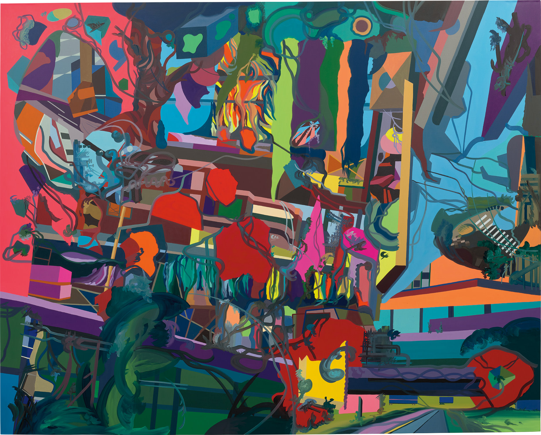 Franz Ackermann's 2010 oil on canvas depicts 'Rupalee: former cultural center,' capturing a vibrant architectural space through the artist's distinctive colorful and energetic style. The work reflects Ackermann's interest in exploring urban landscapes and the social spaces they contain.