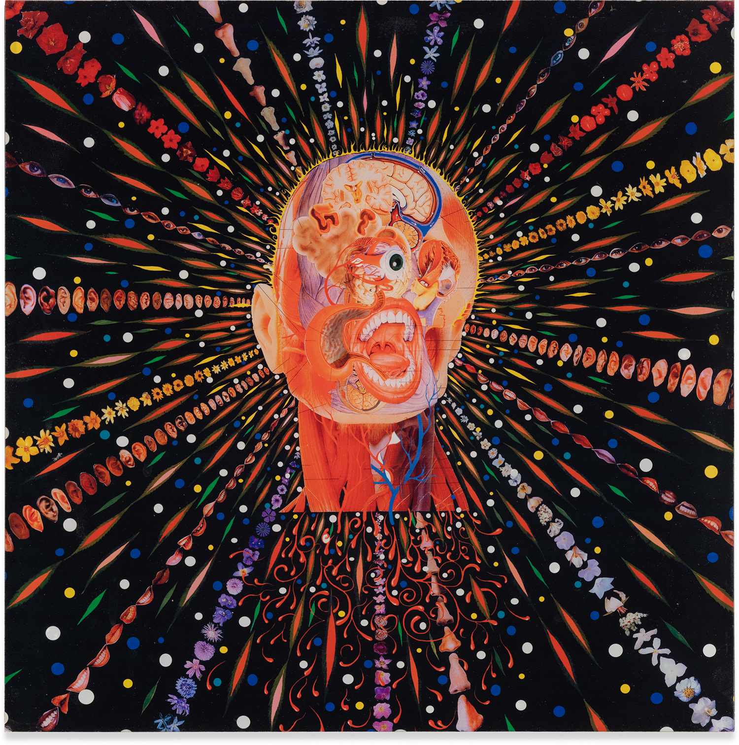 A surface-mounted pigment print on Plexiglas by Fred Tomaselli exploring optical perception and visual complexity. The work combines photographic imagery with materials that create layered visual effects.