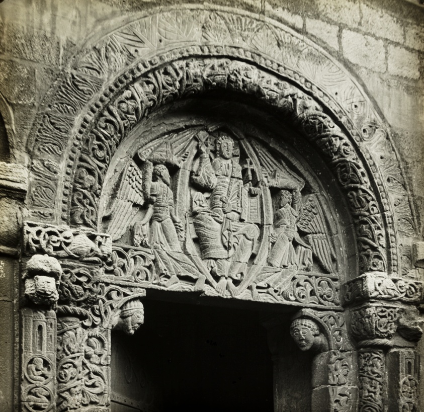 Intricate medieval stone carving above the Prior's Door showcases the skilled craftsmanship of Ely's monastic builders. Evans' close attention to decorative details complemented his grand architectural views, creating a comprehensive visual record of the cathedral.