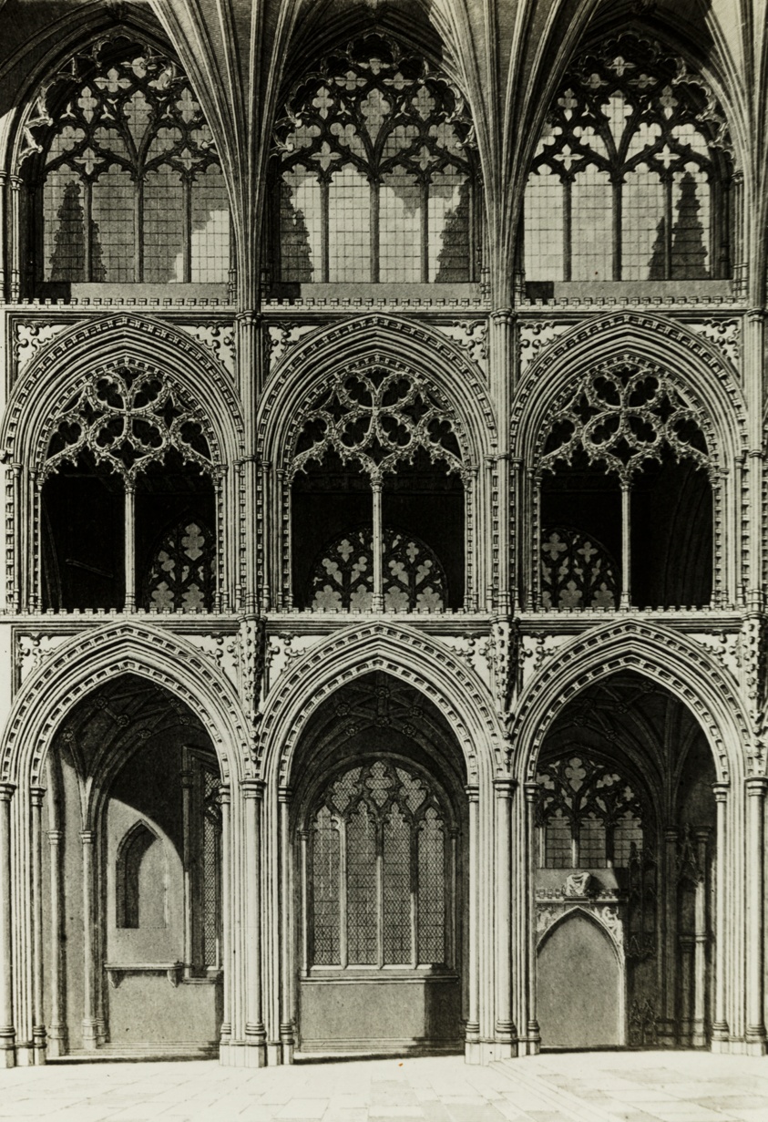 Reproduced from an engraving, Evans' slide documents the choir's architectural configuration as recorded by earlier artists. His inclusion of historical imagery alongside contemporary photographs created a more complete visual archive of the cathedral's evolution.