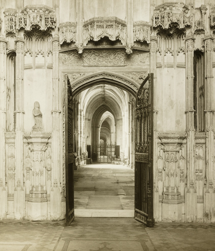 Moving from the intimate scale of a side chapel into the soaring choir aisle, Evans creates a sense of architectural journey while demonstrating his skill at capturing complex spatial relationships in medieval buildings.
