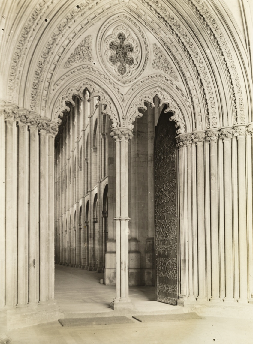 Evans' view through the cathedral's western entrance reveals his understanding of architectural sequence and his ability to use doorways and passages as compositional elements.