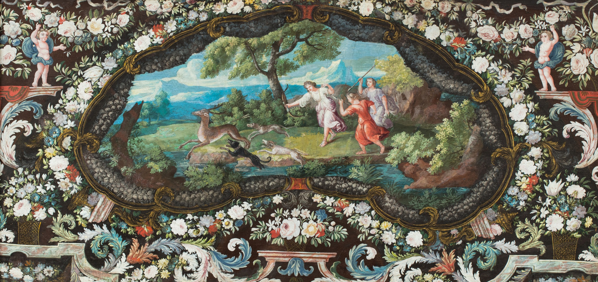 This 18th-century French School gouache, 'Diane chassant, étude pour un éventail,' is heightened with gold and scored in the shape of a fan. The work represents a preparatory study for a decorative fan, showcasing the ornamental aesthetic of the period.