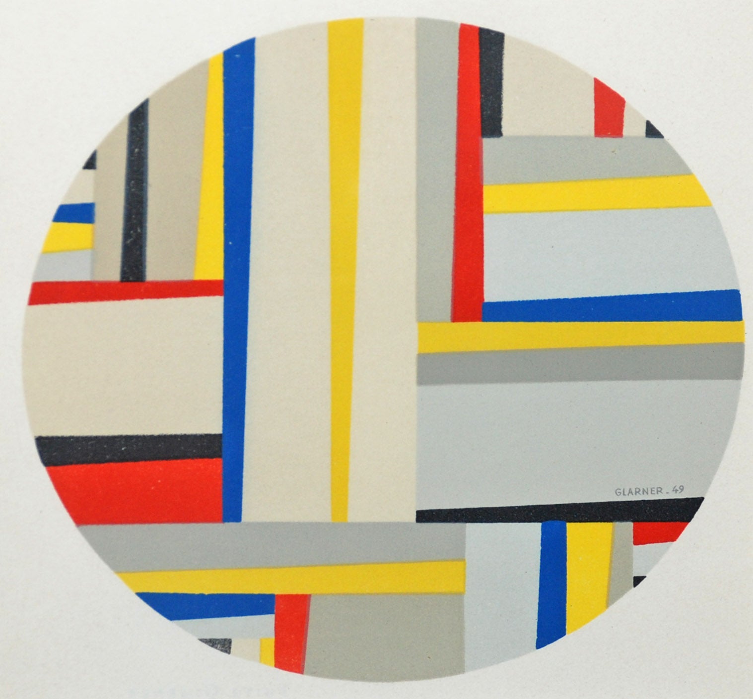 This lithograph exemplifies Fritz Glarner's distinctive approach to geometric abstraction during the mid-twentieth century. Executed in 1964 from the prestigious Mourlot Press Portfolio, the composition employs a carefully orchestrated arrangement of angular forms and linear elements that dance across the circular format. The tondo presents Glarner's signature vocabulary of interlocking planes rendered in subtle tonal gradations, creating a dynamic tension between the infinite geometry and the containing circle. The work demonstrates the artist's commitment to pure abstraction while maintaining a sense of compositional balance and visual rhythm that recalls his engagement with both Constructivism and the American avant-garde. As part of a limited edition of 2000 impressions from the esteemed Mourlot atelier in Paris, this lithograph represents an important moment in Glarner's career when he was at the height of his artistic powers. The medium allowed for precise control of value and line quality, qualities essential to the artist's investigation of spatial relationships and color interaction. For collectors, this work offers access to a significant example of post-war geometric abstraction at an accessible scale and price point, capturing the intellectual rigor and visual sophistication that defined Glarner's lifelong pursuit of ordered beauty through abstract form.