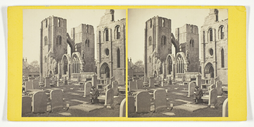 Wilson's stereoscopic photograph preserves the Gothic grandeur of this ruined 13th-century cathedral, showcasing the dramatic interplay of light and shadow across weathered stone transepts.
