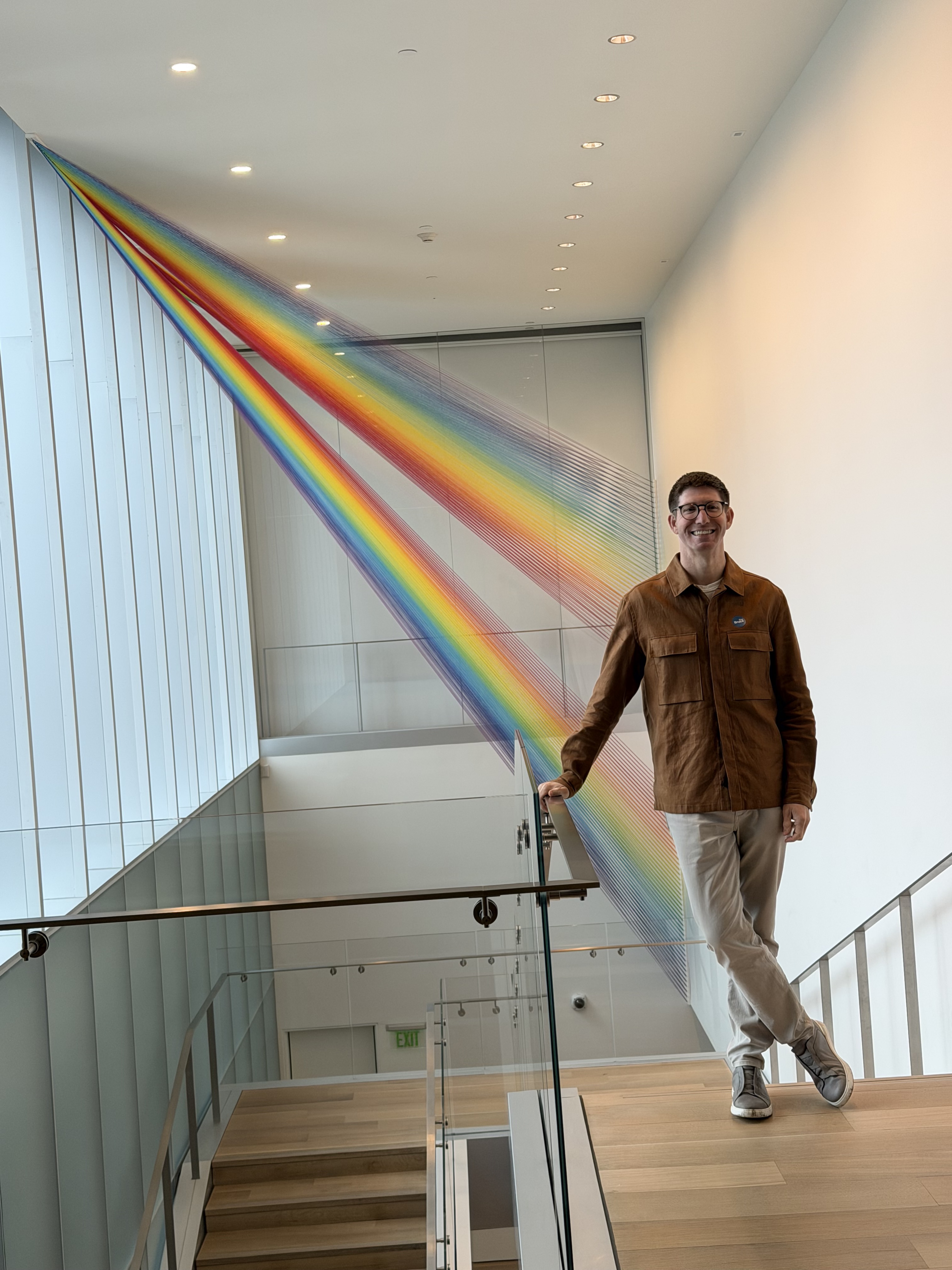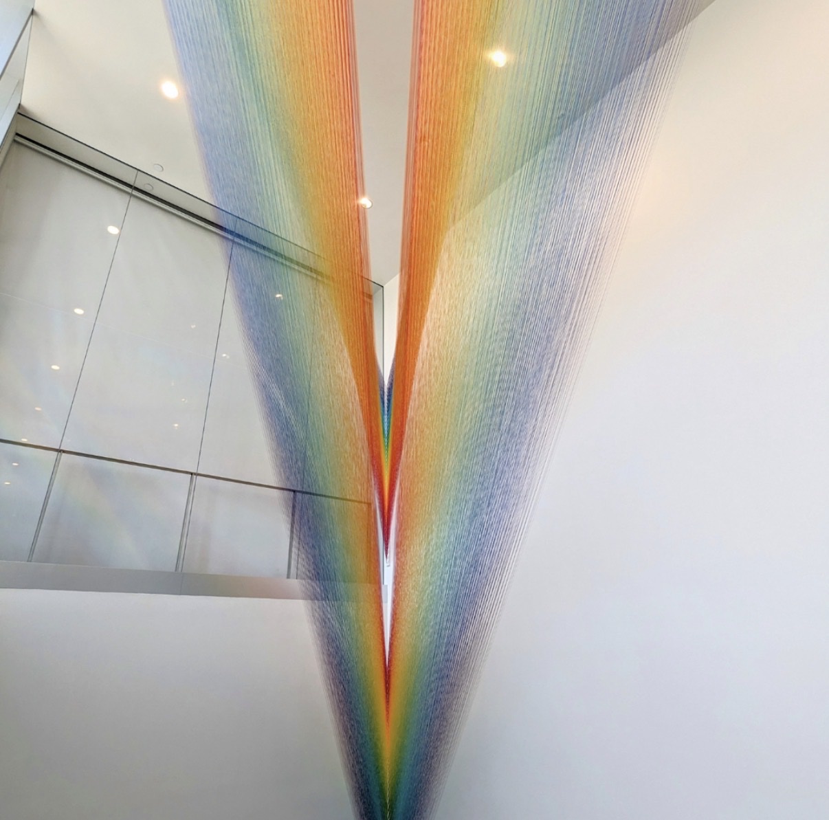 A monumental site-specific thread installation by Gabriel Dawe, 'Plexus no. 43' (2023) cascades diagonally across a multi-story stairwell in a sweeping gradient of spectral color—violet through red, orange, yellow, and blue—evoking the optical diffusion of light and a prismatic rainbow effect. Thousands of individual threads are stretched between painted wood and steel hooks, creating an immersive, three-dimensional textile field that transforms architectural space. Part of Dawe's celebrated Plexus series, the work exemplifies his ongoing investigation into color, perception, and the boundary between painting and sculpture. Acquired as accession number 2024.02, this large-scale installation commands significant institutional presence.