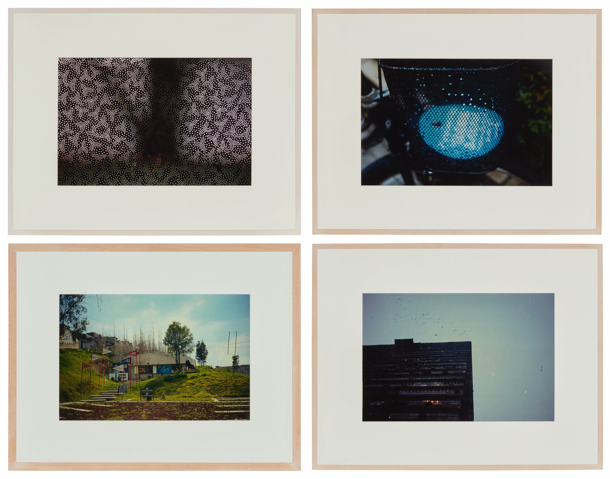 Gabriel Orozco's 1998 work comprises four cibachrome prints exploring themes of urban space, nature, and social commentary through poetic imagery. Titles such as 'Castillo en el aire o el león de la plusvalía' and 'lluvia en Tokio' suggest connections between places and concepts.