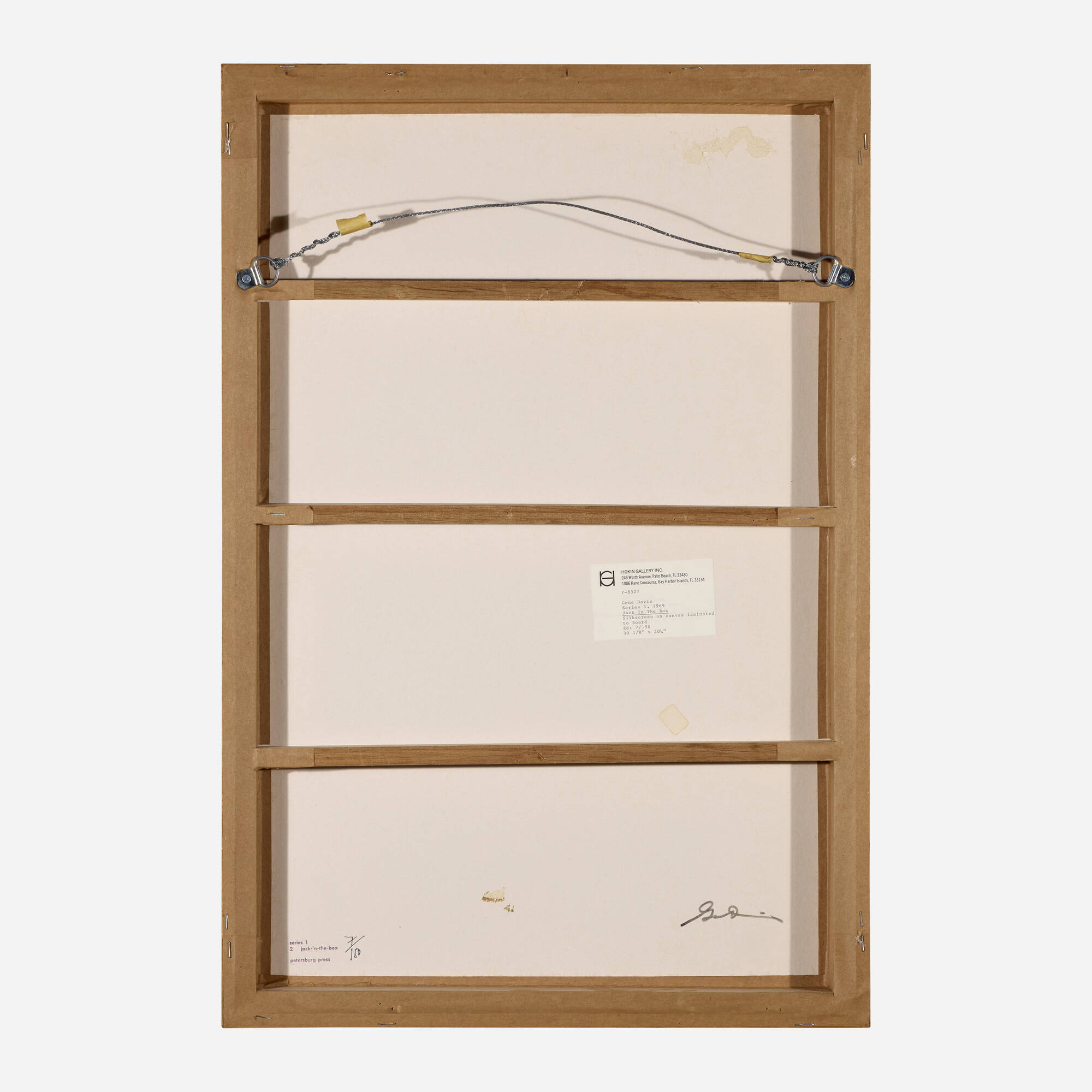 Jack In The Box is a screenprint from the Series I portfolio created in 1969, featuring colors applied to canvas that has been laminated to board. The work employs dynamic vertical striping characteristic of Davis's artistic practice. The unusual combination of canvas and board support adds dimensionality to the traditionally flat medium of screenprinting. This piece represents Davis's experimental approach to materials and surface preparation during the late 1960s. The work bridges painting and printmaking traditions through its hybrid construction.