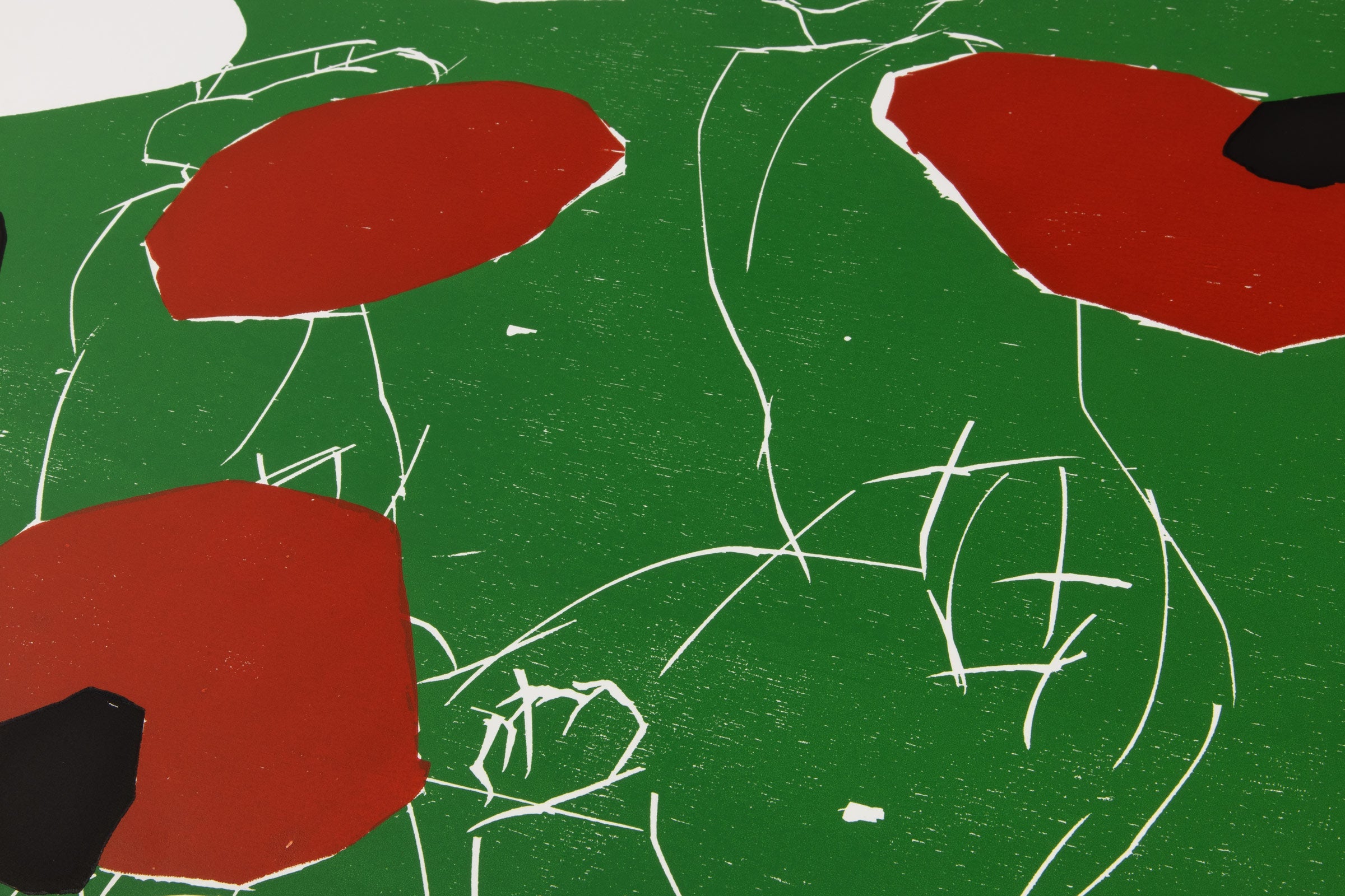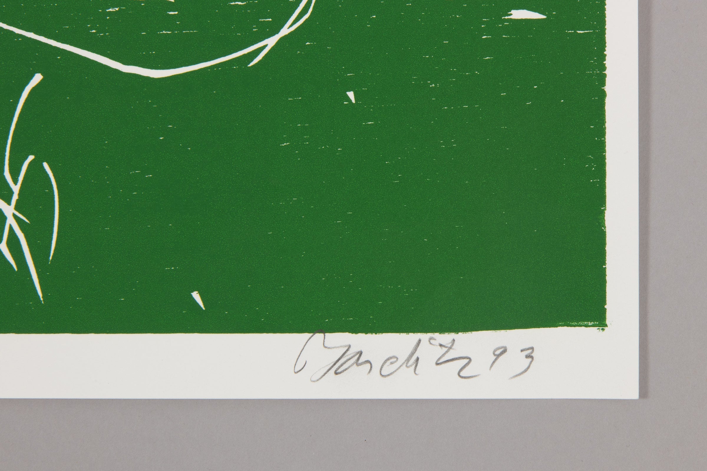 Georg Baselitz ’s Puck (1993) is a signed limited edition woodcut on wove paper, measuring 103 × 72 cm. Dominated by a vivid green ground punctuated by bold red and black forms, the composition fuses figurative suggestion with forceful abstraction. Scratched, linear contours outline inverted, fragmented bodies, while the flattened color fields heighten the print’s graphic intensity and physical presence. Created in 1993 in connection with the Ice Hockey World Championship in Dortmund, Puck reflects Baselitz’s ongoing engagement with movement, inversion, and the expressive potential of the woodcut medium. The rough-hewn edges, visible grain, and stark contrasts underscore his interest in immediacy and material resistance, hallmarks of his printmaking practice in the 1990s. Executed in an edition of 300, this fine art print is hand-signed and numbered by the artist, representing a dynamic example of Baselitz’s large-scale woodcuts from this period.