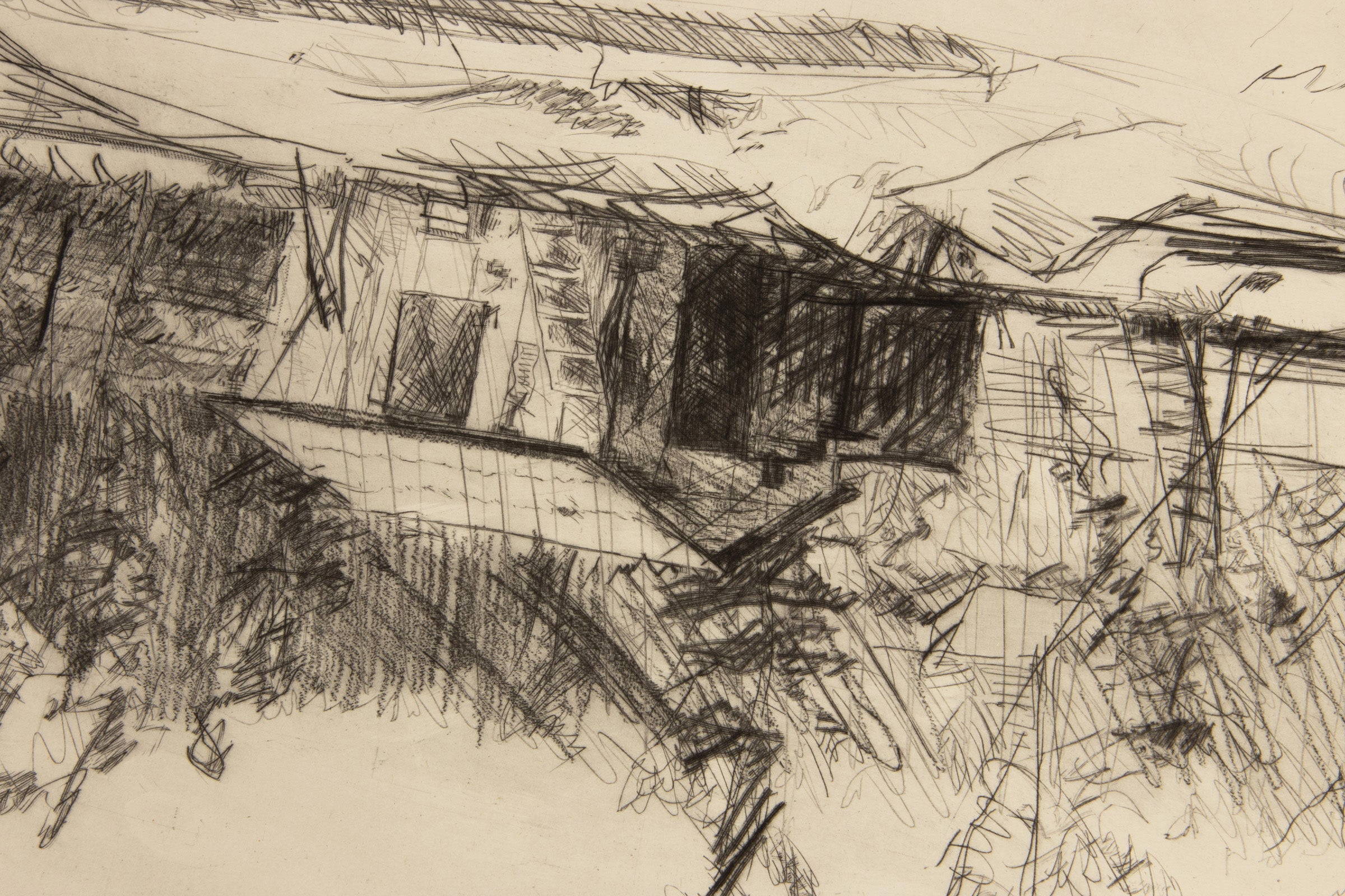 Georg Baselitz ’s Untitled (from Eine Woche) is a signed etching on chine-collé mounted to wove paper, published in the 1972 portfolio Eine Woche by Galerie Heiner Friedrich, Munich. Created during a pivotal moment in the early 1970s, the artwork reflects Baselitz’s concentrated engagement with printmaking. The limited edition print depicts a fragmented architectural structure rendered in angular, forceful lines. Space appears unstable, with forms compressed and skewed rather than perspectivally resolved. The raw, scratch-like mark-making underscores Baselitz’s interest in distortion and psychological tension, themes that define his work of this period. As part of the 1972 portfolio, the fine art print demonstrates Georg Baselitz’s exploration of etching as a medium capable of conveying immediacy and raw intensity. The chine-collé technique enhances tonal depth while preserving the nervous energy of the etched mark. Issued in an edition of 52 and hand-signed in pencil, this impression is an unnumbered print outside the edition.