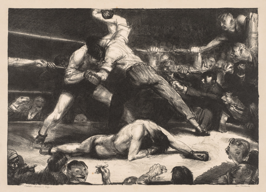 Capturing the raw energy of boxing through bold, dynamic strokes, this lithograph exemplifies Bellows' mastery of sports subjects and his ability to convey motion and drama in black and white.