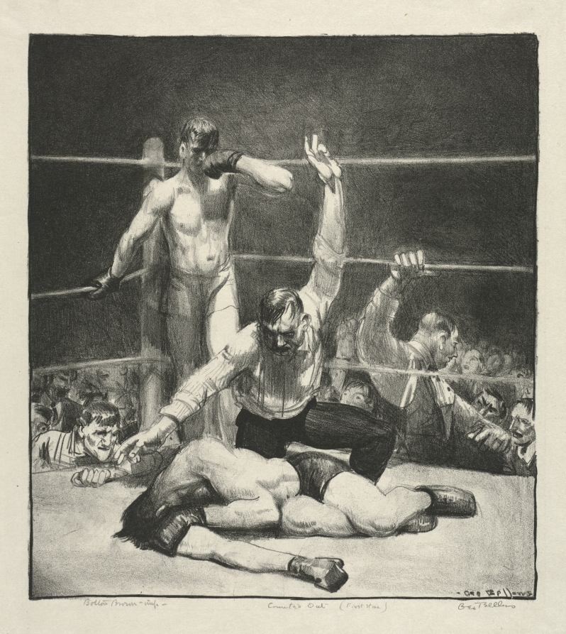 Boxing imagery, a signature subject for Bellows, demonstrates his ability to freeze moments of intense physical drama while exploring themes of violence and spectatorship.