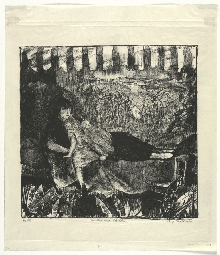 Tender domestic intimacy unfolds through bold lithographic strokes, showcasing Bellows' ability to find profound beauty in everyday family moments.