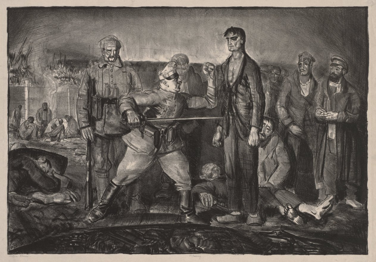 Part of Bellows' war series commenting on military injustice, combining his skills as a printmaker with his role as social critic during World War I.