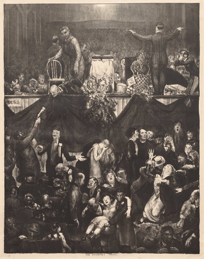 Religious revival meeting scene captures the theatrical drama of American evangelism with Bellows' characteristic energy and social observation.