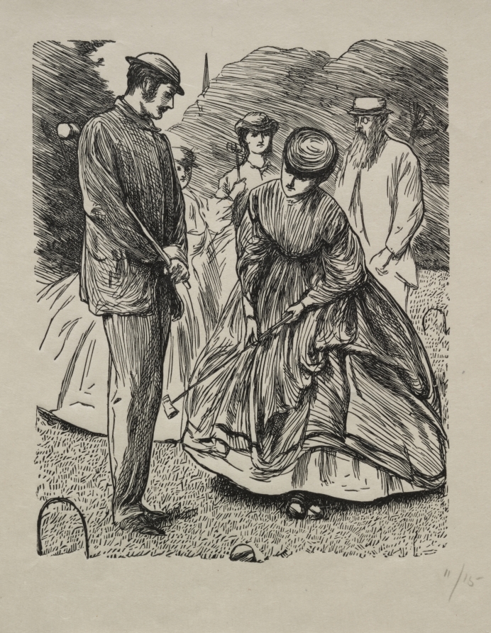 Social etiquette and competitive spirit collide in this engraving, where Du Maurier's anthropological eye captures the ritualized nature of Victorian recreational life.
