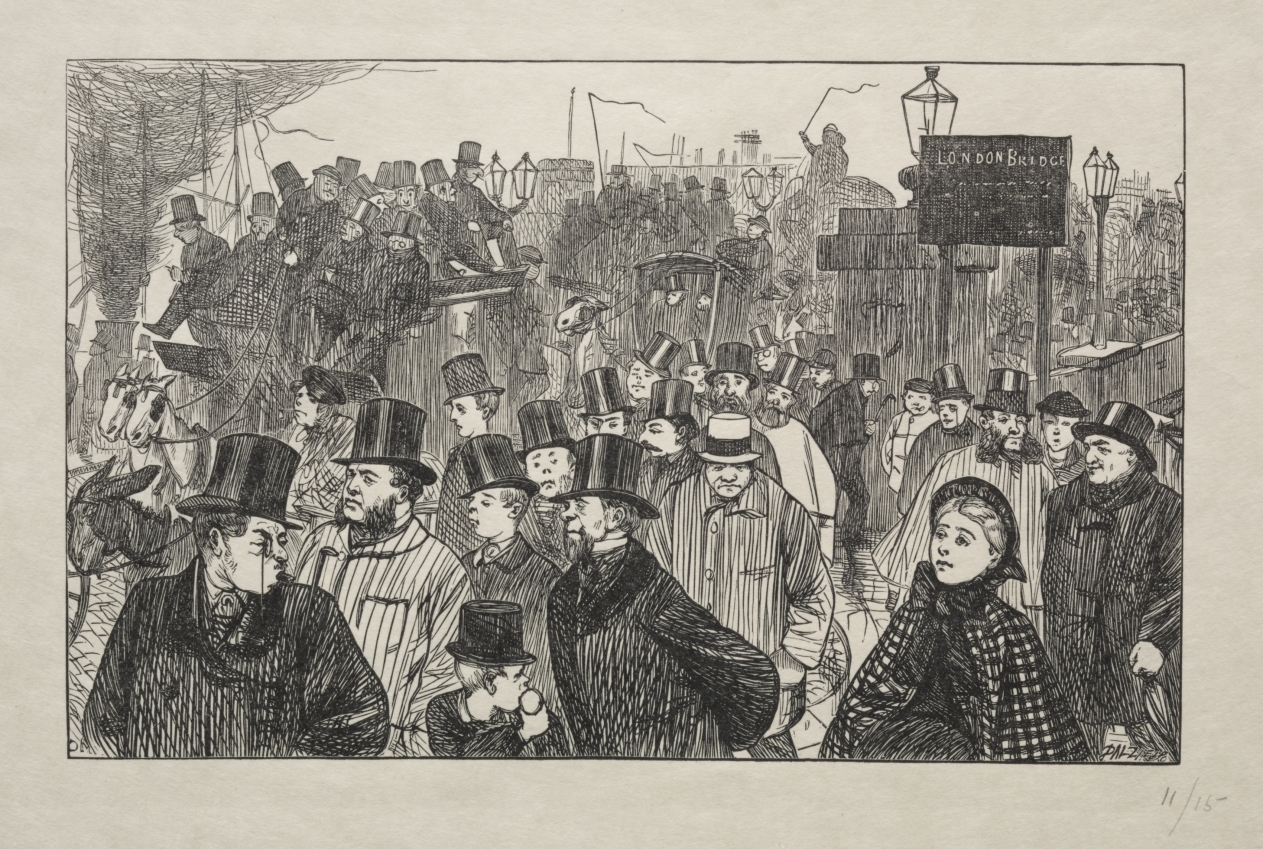 George Louis Palmella Busson Du Maurier, The Living Stream at London Bridge - On the Bridge, 1863